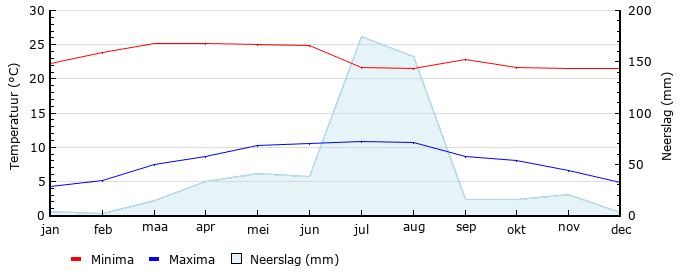 | Gem. max. temperatuur in °C | 22.3 | 23.8 | 25.1 | 25.1 | 25.0 | 24.9 | 21.6 | 21.5 | 22.9 | 21.7 | 21.5 | 21.5 |