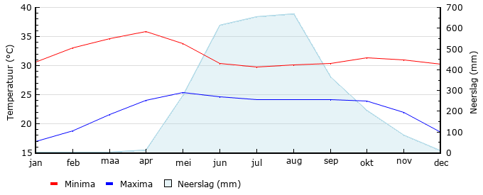 | Gem. max. temperatuur in °C | 30.6 | 33.1 | 34.6 | 35.8 | 33.8 | 30.4 | 29.8 | 30.1 | 30.4 | 31.3 | 31.0 | 30.2 |