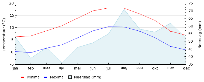 | Gem. max. temperatuur in °C | 6.2 | 6.6 | 8.6 | 10.7 | 13.8 | 16.8 | 18.1 | 17.9 | 15.6 | 12.9 | 8.5 | 6.8 |