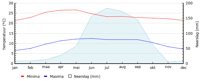 | Gem. max. temperatuur in °C | 21.3 | 22.9 | 25.4 | 26.5 | 26.6 | 24.7 | 23.2 | 23.4 | 22.9 | 22.6 | 22.2 | 21.3 |