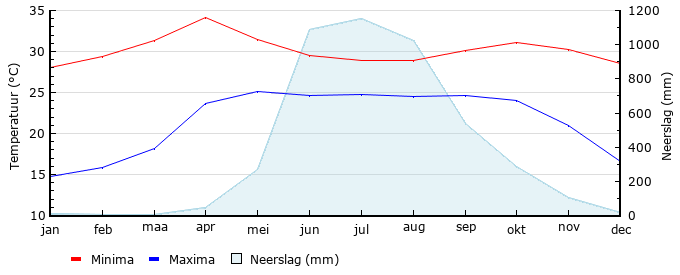 | Gem. max. temperatuur in °C | 28.0 | 29.4 | 31.4 | 34.1 | 31.5 | 29.5 | 28.9 | 28.9 | 30.1 | 31.1 | 30.3 | 28.5 |