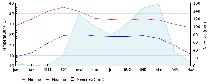 | Gem. max. temperatuur in °C | 29.1 | 32.4 | 36.1 | 38.1 | 36.0 | 32.7 | 32.3 | 32.0 | 32.6 | 31.9 | 29.9 | 28.3 |