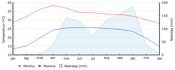 | Gem. max. temperatuur in °C | 28.6 | 32.0 | 36.2 | 38.4 | 36.9 | 34.3 | 34.3 | 33.4 | 33.2 | 32.3 | 30.2 | 28.2 |