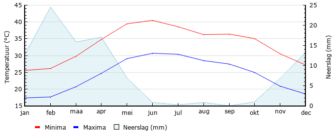 Gem. max. temperatuur in °C | 25.5 | 26.1 | 29.8 | 34.7 | 39.5 | 40.4 | 38.6 | 36.2 | 36.3 | 35.0 | 30.5 | 27.1 |