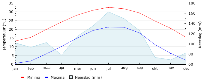 | Gem. max. temperatuur in °C | 13.4 | 15.4 | 20.0 | 24.3 | 28.1 | 30.9 | 32.6 | 31.8 | 29.4 | 24.8 | 20.6 | 15.4 |
