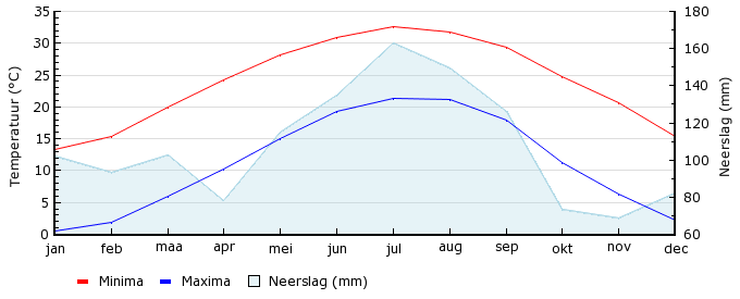 | Gem. max. temperatuur in °C | 13.4 | 15.4 | 20.0 | 24.3 | 28.1 | 30.9 | 32.6 | 31.8 | 29.4 | 24.8 | 20.6 | 15.4 |