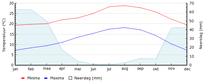 | Gem. max. temperatuur in °C | 19.3 | 19.8 | 20.0 | 21.9 | 22.9 | 25.0 | 28.2 | 28.9 | 27.8 | 25.8 | 22.3 | 19.4 |