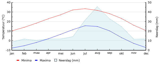 | Gem. max. temperatuur in °C | 10.3 | 13.9 | 18.2 | 22.9 | 27.1 | 32.1 | 33.3 | 31.8 | 28.4 | 23.2 | 16.0 | 10.6 |
