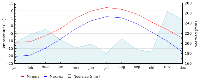 | Gem. min. temperatuur in °C | -20.3 | -19.6 | -14.8 | -8.8 | -1.9 | 3.3 | 6.1 | 5.3 | 1.4 | -4.3 | -10.1 | -17.4 |