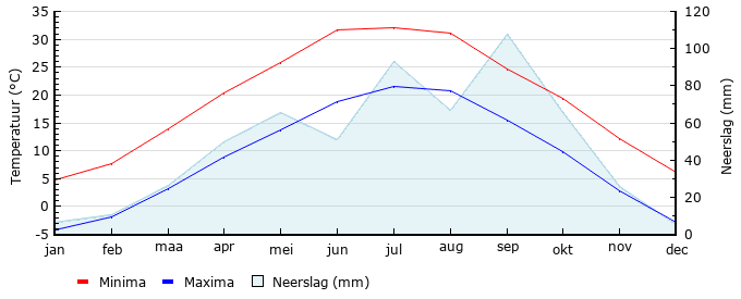 | Gem. min. temperatuur in °C | -4.2 | -1.8 | 3.2 | 8.9 | 13.8 | 18.8 | 21.6 | 20.8 | 15.5 | 9.8 | 2.8 | -2.9 |