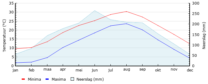 | Gem. max. temperatuur in °C | 9.6 | 10.3 | 13.5 | 18.6 | 22.5 | 25.2 | 28.6 | 30.4 | 27.4 | 22.5 | 17.6 | 12.3 |