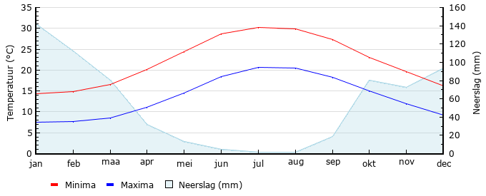 | Gem. max. temperatuur in °C | 14.4 | 14.9 | 16.6 | 20.1 | 24.4 | 28.7 | 30.3 | 29.9 | 27.3 | 23.1 | 19.6 | 16.2 |