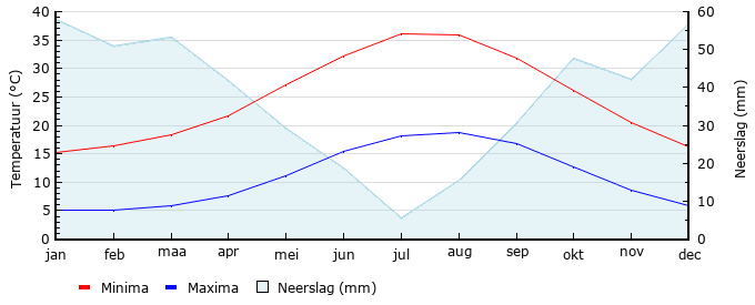 | Gem. max. temperatuur in °C | 15.2 | 16.4 | 18.3 | 21.6 | 27.1 | 32.1 | 36.1 | 35.9 | 31.8 | 26.1 | 20.4 | 16.2 |