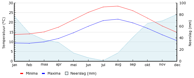 | Gem. max. temperatuur in °C | 13.7 | 14.0 | 15.1 | 17.6 | 21.4 | 25.1 | 28.0 | 28.4 | 26.1 | 22.2 | 18.2 | 14.8 |