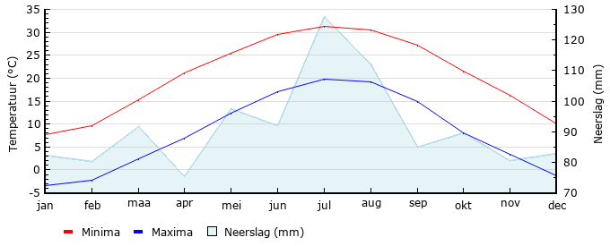 | Gem. max. temperatuur in °C | 7.6 | 9.6 | 15.3 | 21.1 | 25.4 | 29.5 | 31.3 | 30.6 | 27.2 | 21.5 | 16.3 | 10.1 |