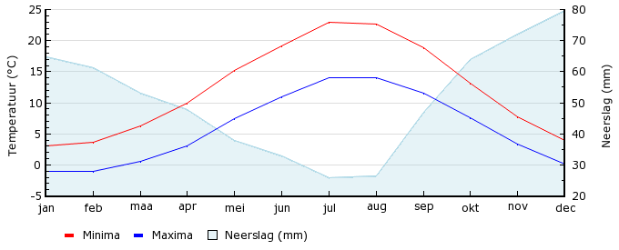 | Gem. min. temperatuur in °C | -1.0 | -1.1 | 0.5 | 3.1 | 7.4 | 11.0 | 14.0 | 14.0 | 11.5 | 7.6 | 3.4 | 0.1 |