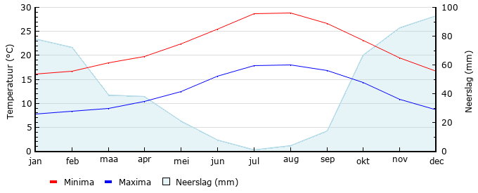 | Gem. max. temperatuur in °C | 16.1 | 16.7 | 18.4 | 19.8 | 22.4 | 25.4 | 28.7 | 28.8 | 26.7 | 23.1 | 19.4 | 16.7 |