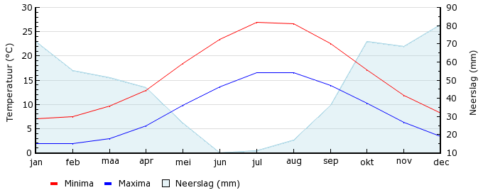 | Gem. max. temperatuur in °C | 7.0 | 7.5 | 9.6 | 12.9 | 18.4 | 23.4 | 26.9 | 26.6 | 22.6 | 17.1 | 11.9 | 8.2 |