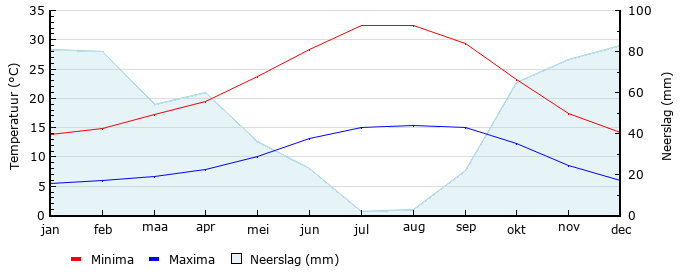| Gem. max. temperatuur in °C | 13.8 | 14.9 | 17.3 | 19.4 | 23.7 | 28.4 | 32.5 | 32.5 | 29.3 | 23.2 | 17.5 | 14.2 |