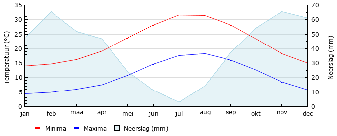| Gem. max. temperatuur in °C | 14.0 | 14.6 | 16.3 | 19.2 | 23.7 | 28.1 | 31.6 | 31.4 | 28.1 | 23.4 | 18.3 | 15.0 |