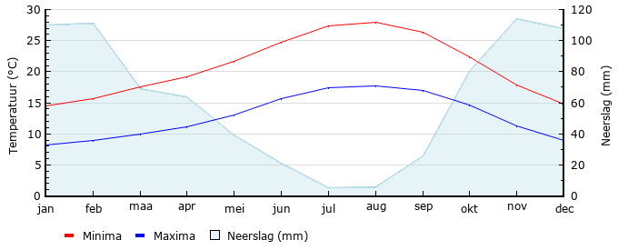| Gem. max. temperatuur in °C | 14.5 | 15.6 | 17.6 | 19.1 | 21.7 | 24.8 | 27.4 | 27.9 | 26.4 | 22.4 | 17.8 | 14.8 |