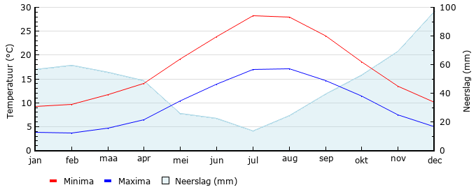 | Gem. max. temperatuur in °C | 9.2 | 9.7 | 11.7 | 14.0 | 19.1 | 23.9 | 28.2 | 27.9 | 24.0 | 18.6 | 13.5 | 10.1 |