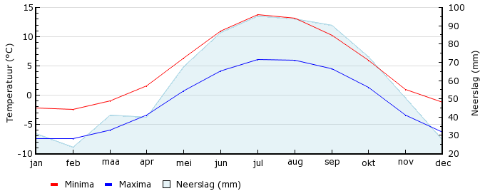 | Gem. min. temperatuur in °C | -7.4 | -7.4 | -6.0 | -3.4 | 0.7 | 4.1 | 6.1 | 6.0 | 4.5 | 1.4 | -3.4 | -6.3 |
