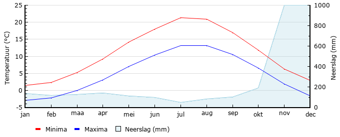 | Gem. min. temperatuur in °C | -3.0 | -2.2 | 0.0 | 3.0 | 7.0 | 10.4 | 13.1 | 13.1 | 10.5 | 6.5 | 1.9 | -1.6 |