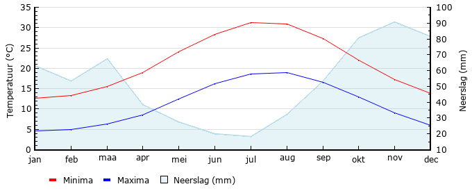 | Gem. max. temperatuur in °C | 12.6 | 13.3 | 15.5 | 19.0 | 24.0 | 28.3 | 31.2 | 30.9 | 27.4 | 22.1 | 17.3 | 13.8 |