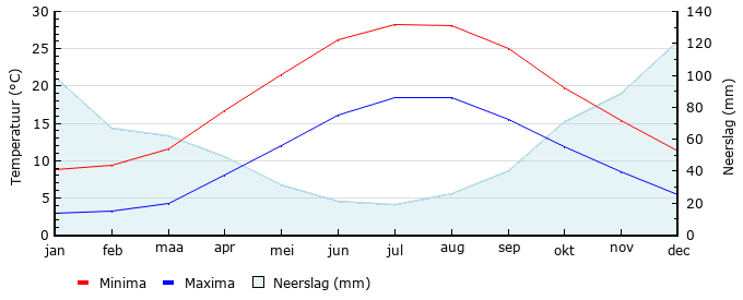 | Gem. max. temperatuur in °C | 8.8 | 9.4 | 11.6 | 16.7 | 21.5 | 26.2 | 28.2 | 28.1 | 25.0 | 19.8 | 15.4 | 11.2 |