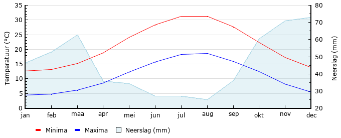 | Gem. max. temperatuur in °C | 12.6 | 13.1 | 15.2 | 18.8 | 24.0 | 28.4 | 31.2 | 31.2 | 27.6 | 22.3 | 17.3 | 13.8 |