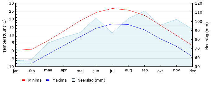 | Gem. max. temperatuur in °C | .3 | .9 | 6.4 | 12.5 | 18.8 | 24.1 | 26.6 | 25.8 | 22.3 | 16.1 | 9.7 | 3.2 |