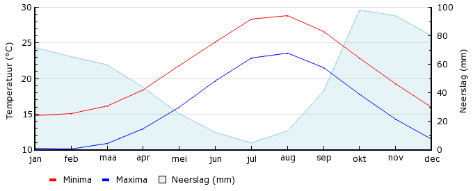 | Gem. max. temperatuur in °C | 14.8 | 15.1 | 16.1 | 18.4 | 21.8 | 25.1 | 28.3 | 28.8 | 26.6 | 22.9 | 19.3 | 16.0 |