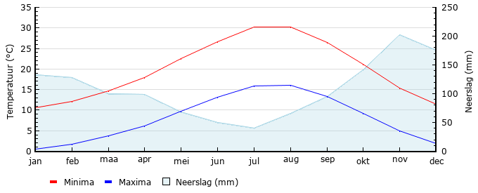 | Gem. max. temperatuur in °C | 10.6 | 12.1 | 14.7 | 17.9 | 22.6 | 26.6 | 30.3 | 30.2 | 26.5 | 21.2 | 15.3 | 11.5 |