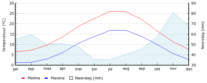 | Gem. max. temperatuur in °C | 6.4 | 7.1 | 9.7 | 13.6 | 18.8 | 22.6 | 26.1 | 25.9 | 22.1 | 16.6 | 11.2 | 7.6 |