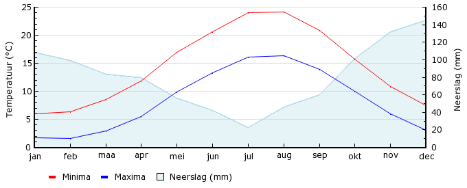 | Gem. max. temperatuur in °C | 6.0 | 6.3 | 8.5 | 11.8 | 16.9 | 20.6 | 24.0 | 24.1 | 20.8 | 15.7 | 10.9 | 7.4 |