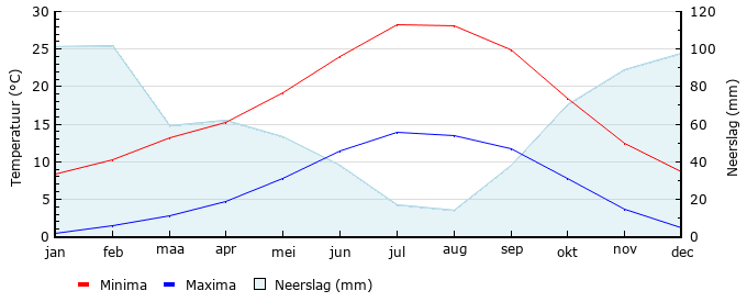| Gem. max. temperatuur in °C | 8.4 | 10.3 | 13.2 | 15.2 | 19.1 | 24.0 | 28.3 | 28.1 | 24.9 | 18.4 | 12.4 | 8.7 |