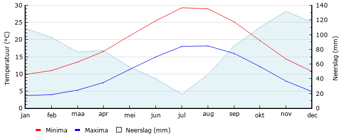 | Gem. max. temperatuur in °C | 9.8 | 11.0 | 13.5 | 16.5 | 21.1 | 25.4 | 29.2 | 29.0 | 25.2 | 19.8 | 14.3 | 10.7 |