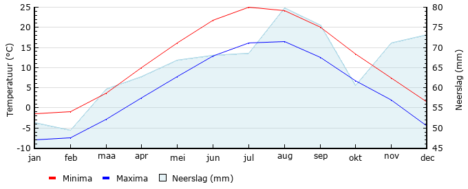 | Gem. max. temperatuur in °C | -1.4 | -0.9 | 3.6 | 10.0 | 16.2 | 21.7 | 25.0 | 24.2 | 20.0 | 13.4 | 7.4 | 1.4 |