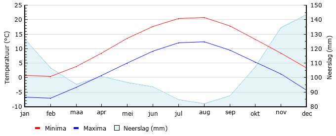 | Gem. min. temperatuur in °C | -6.8 | -7.1 | -3.4 | 0.8 | 5.1 | 9.2 | 12.1 | 12.4 | 9.4 | 5.3 | 1.3 | -4.3 |