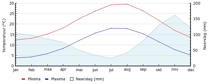 | Gem. max. temperatuur in °C | 12.5 | 13.2 | 15.2 | 18.2 | 22.6 | 26.2 | 29.3 | 29.5 | 26.3 | 21.8 | 17.0 | 13.6 |