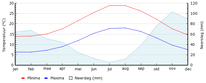 | Gem. max. temperatuur in °C | 13.9 | 14.1 | 15.1 | 17.5 | 21.5 | 25.4 | 28.9 | 28.8 | 26.2 | 22.3 | 17.6 | 14.7 |