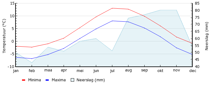 | Gem. min. temperatuur in °C | -6.4 | -6.8 | -5.3 | -2.8 | 1.1 | 4.9 | 8.0 | 7.7 | 5.2 | 1.8 | -2.6 | -5.2 |