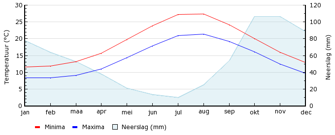 | Gem. max. temperatuur in °C | 11.6 | 11.8 | 13.1 | 15.6 | 19.7 | 23.9 | 27.2 | 27.3 | 24.2 | 20.0 | 15.9 | 12.9 |