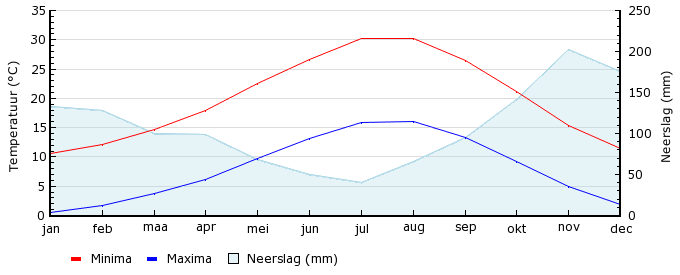 | Gem. max. temperatuur in °C | 10.6 | 12.1 | 14.7 | 17.9 | 22.6 | 26.6 | 30.3 | 30.2 | 26.5 | 21.2 | 15.3 | 11.5 |