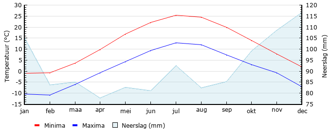 | Gem. max. temperatuur in °C | -0.9 | -0.8 | 3.7 | 9.7 | 16.8 | 22.2 | 25.3 | 24.5 | 19.8 | 13.9 | 7.8 | 1.8 |