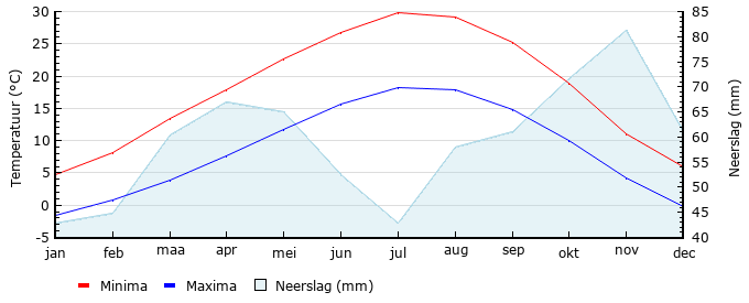 | Gem. max. temperatuur in °C | 4.8 | 8.2 | 13.4 | 17.8 | 22.7 | 26.8 | 29.9 | 29.2 | 25.3 | 18.9 | 11.1 | 5.9 |