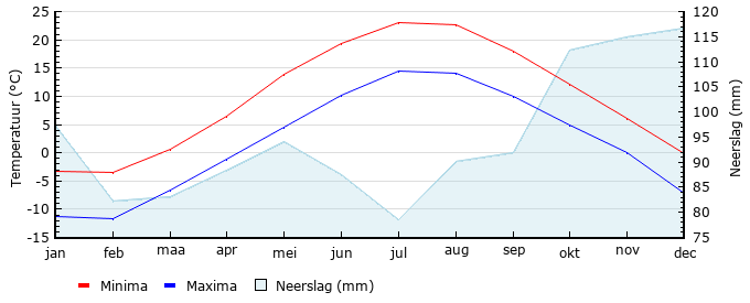 | Gem. max. temperatuur in °C | -3.3 | -3.4 | 0.7 | 6.5 | 13.8 | 19.4 | 23.1 | 22.7 | 18.0 | 12.2 | 6.1 | -0.2 |