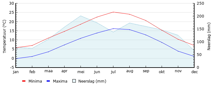 | Gem. max. temperatuur in °C | 5.8 | 7.0 | 11.1 | 14.7 | 18.5 | 22.5 | 25.2 | 24.1 | 20.6 | 15.4 | 10.4 | 6.9 |