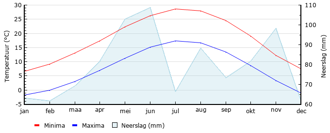 | Gem. min. temperatuur in °C | -1.8 | -0.1 | 3.0 | 6.9 | 11.2 | 15.1 | 17.3 | 16.7 | 13.5 | 8.6 | 3.3 | -1.0 |